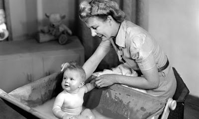 from. My mother would put her legs in the plastic tub and place the baby on her